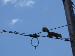 This little squirrel tight-roped his way to safety, pausing midway along the line to watch me and the Sheltie below him. I live in fear of what the Sheltie would do, should one ever drop off the line!
