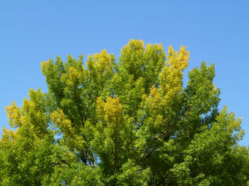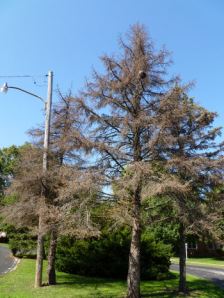 Evergreens stripped of their needles by Summer’s drought (probably won’t recover, either)