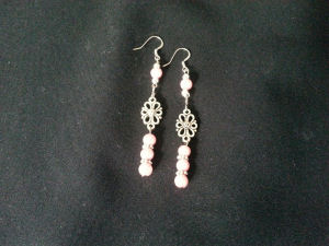 2) Measuring 3 1/2″ in length, each of these earrings contains four 6mm bright pink glass beads (no I don’t usually work with glass beads, but these caught my eye). They’re separated by daisy spacers, 4mm round silver beads, and interconnected with an antique silver flower.
