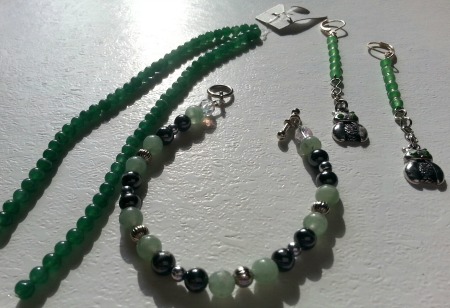 Thanks, Lana! The bracelet is one I made a couple of years ago, but I still love it. Love how pale green these stones appear intermixed with the hematite. As for the earrings, well, they’re just whimsy. You probably can’t see from the photo, but these are little fat owls — with sparkly green eyes — dangling from the Aventurine.
