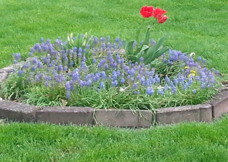 Here’s a pretty planting. I like the lone red tulips amid these blue whatevers:
