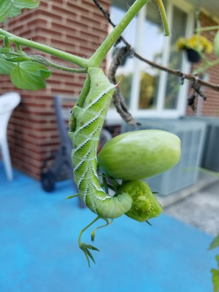 Tomato hornworm, AKA five-spotted hawkmoth (https://en.wikipedia.org/wiki/Manduca_quinquemaculata)