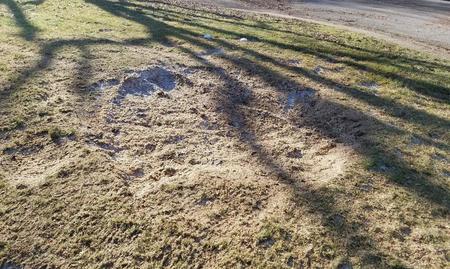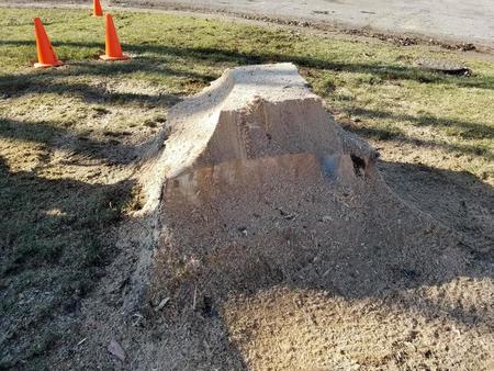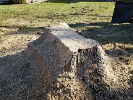 Much of the heavy lifting came when they sawed the four trunks into moveable segments to haul away. The dropping of those heavy segments produced numerous holes in the ground. Three days before Christmas 2018, they were down to the stump but cautioned its removal might prove challenging. They thought someone had poured concrete into it, and they feared for the safety of their grinder. (See the whiteish chunk on the right, below the lowest ridge?):