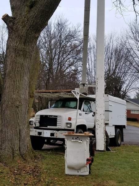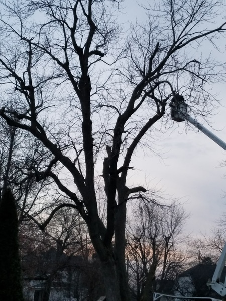 Because this was a “line tree,” both neighbors had to agree on its disposition. We contacted several experts who advised removing it, as it had reached its life expectancy and would likely topple onto our roofs in a future storm. Eventually, our neighbor rationalized away his objections to the project’s cost, and one day this huge “basket crane” appeared: