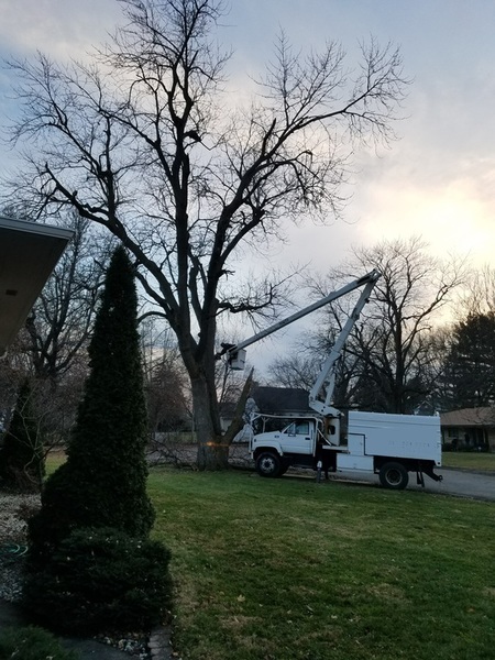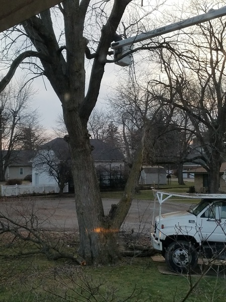 A crew of up to three experts trimmed first the top, lighter branches down to the four-pronged trunk. They used a wood chipper to grind away the numerous branches they’d dropped to the ground: