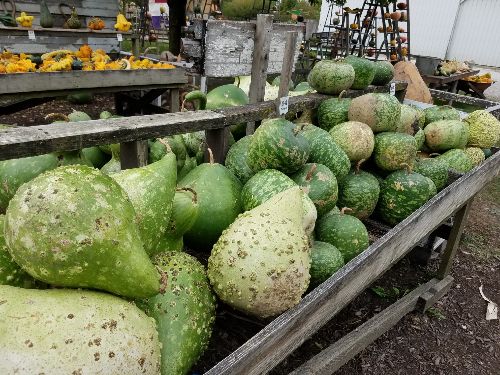 Here, they grow more than 300 varieties of pumpkins, squash, and gourds from more than 30 countries around the world. There are green knotty varieties: