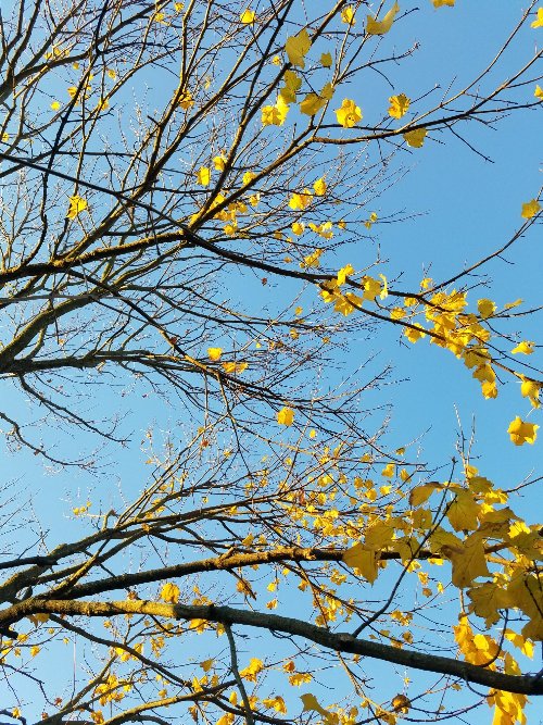 Denim blue sky–I love that description! And the autumn leaves still hanging on. A new day to enjoy, indeed.