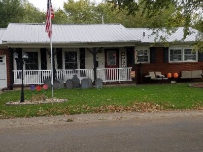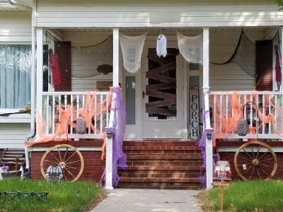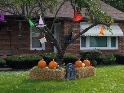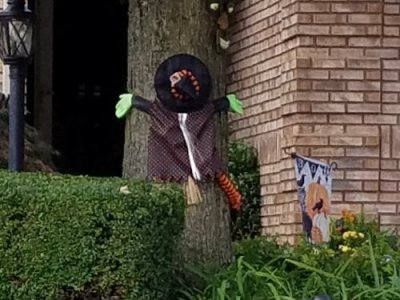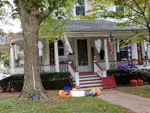 Homeowners here like to decorate. Pumpkins, mums, and “Welcome Fall” signs share space with witches, ghosts, spiders, and what-not. One traditional “decoration” is toilet paper (seriously!) as kids treat their pals to after-the-football-game clean up duty: