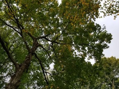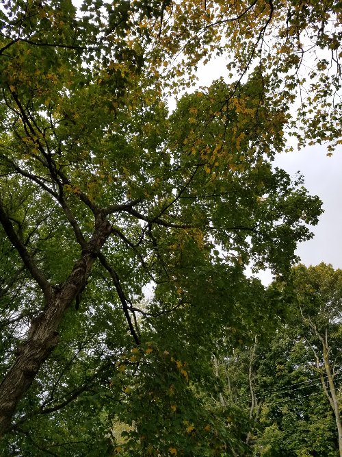 Most of our trees are still green. Some are showing spots of yellow like this one. Others have leaves that are brown and ready to drop. It’s a mixed bag.