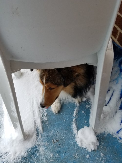 Monkey, too, has been licking at it and trying to chomp on the icicles after they drop. Maybe a storm of this magnitude is just too overwhelming for a little Sheltie, but I’d think knowledge of winter would run in his DNA.