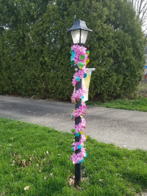 Oh, look — somebody’s decorated their lamp post with glittery Easter eggs and garland:
