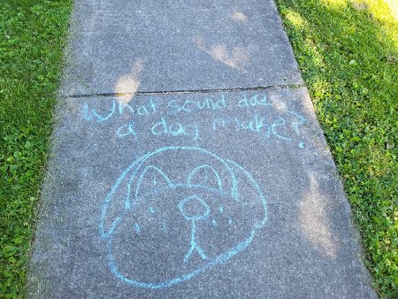 One day, we noticed a lengthy sidewalk filled with pictures and suggestions in colored chalk. Monkey seemed impervious to them, but he doesn’t read (yet!).