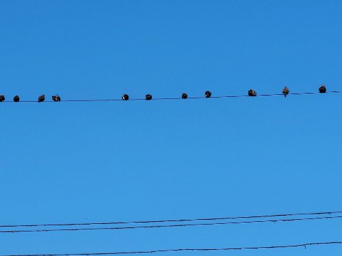 I’m always intrigued by birds’ obvious desire to maintain their personal space. When a new one flies in to sit on a wire, the others adjust where they’re sitting so that the space between them remains the same. I suspect these are just as concerned with leaving a good bit of space between themselves and that canine!