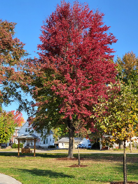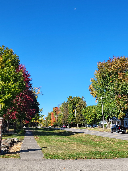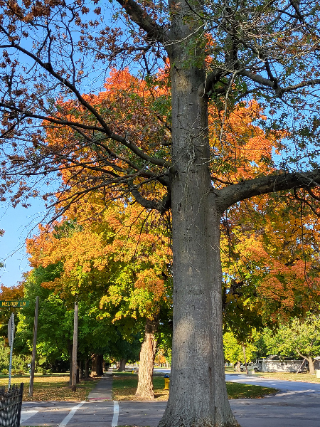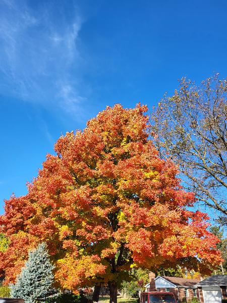 Trees really do march to the beat of their own drum when it comes to dropping their leaves. See how these two, across a street from one another, show how one is nearly bare of leaves while the other is in full color: