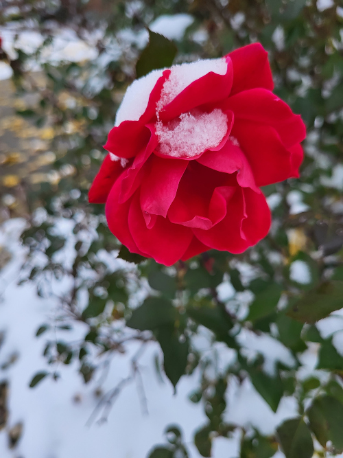 The rose is beautiful enough, but the touch of snow on it makes it even more so.