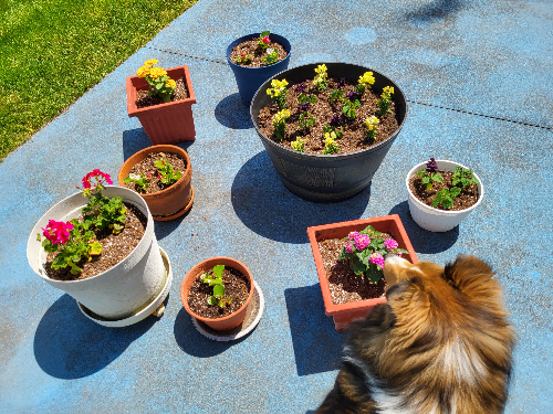 Miss Linda, I Monkey don’t bother Mama’s flowers! I give them a sniff now and then, but she’d tan my hide if I took a chomp out of them. And Shelties really aren’t diggers, not like terriers. Now, if those flower pots ever started to move around by themselves, you can bet your bottom dollar I’d be herding them into a corner somewhere though!