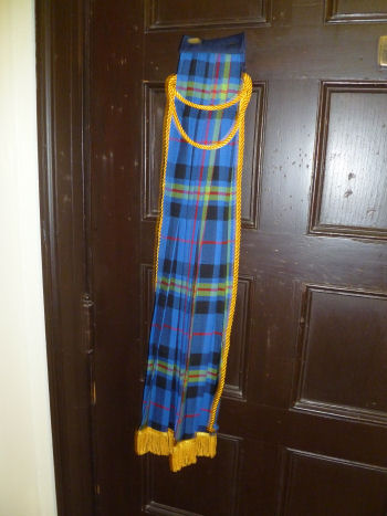 The plaid is outlined in gold and has the senior Band student’s name embroidered on the inside. It buttons to the epaulets on the left shoulder and drapes behind the student, providing an eye-catching shimmer when the Band spins and moves.