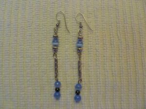 1) These dangly earrings each feature three 6mm denim blue cat’s eye beads, interspersed with a 4mm hematite bead, antique round silver beads, and an antique silver tube bead in the middle. They remind me of summer — denim usually does — and what better way to celebrate the end of summertime than with beads?