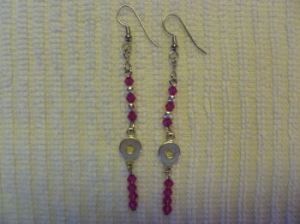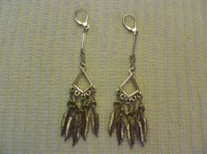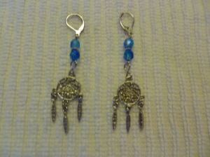 3) Native American cultures have long hung dreamcatchers over beds to catch bad dreams in the net and filter good dreams down through feathers to the sleeper. That lovely tradition is what this pair of earrings is based on. I used two faceted turquoise Czech glass beads with a silver spacer in each one and a leverback closure for increased security.