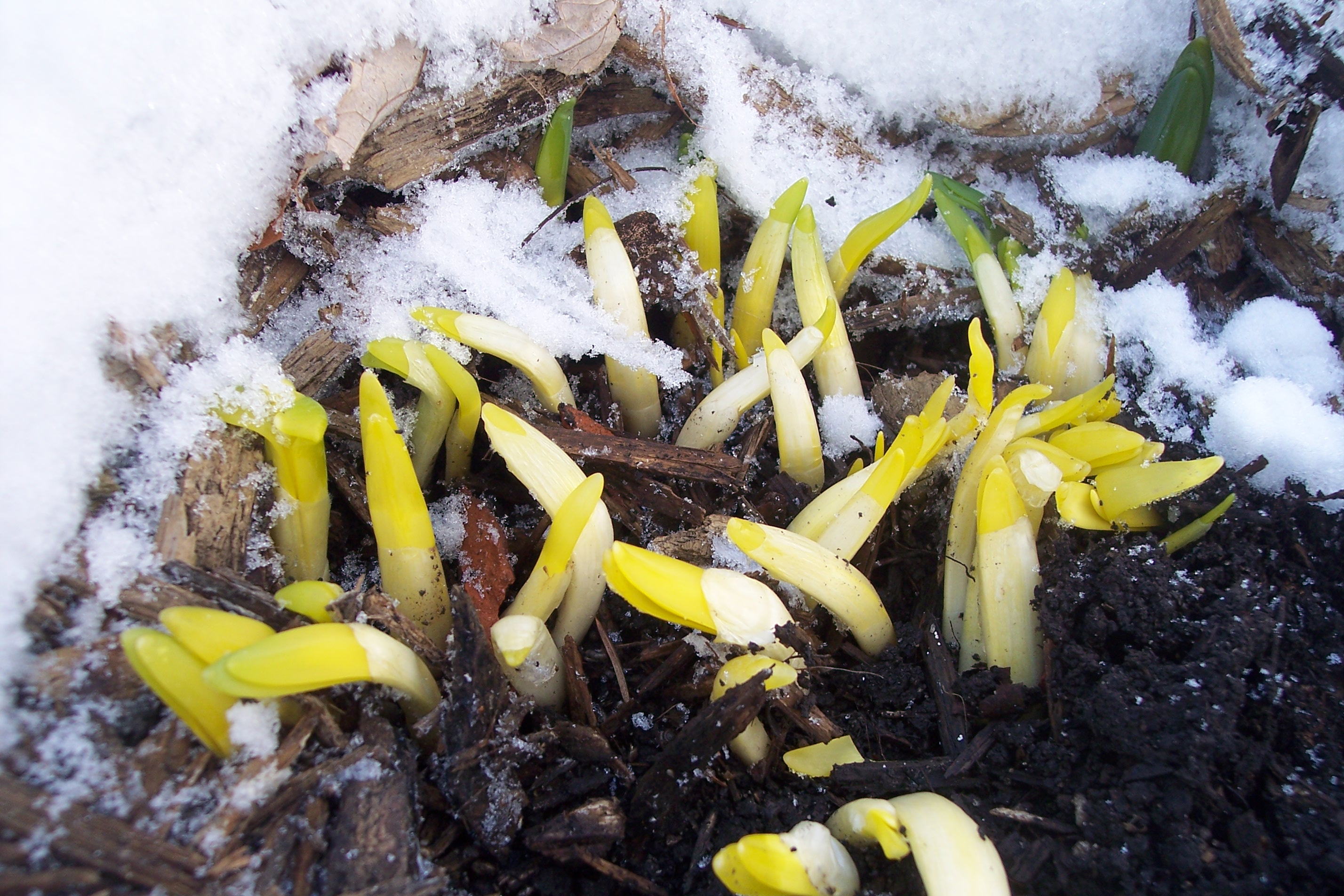 Yep, a whole crop of daffodils and tulips have poked their noses through the ground (and the snow!), in preparation for their annual display of color.